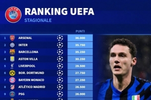 体育资讯4月17日讯 德国转会市场统计了各队本赛季的欧战积分,并列出榜单,阿森纳36分居首,国米、巴萨、维拉二到四位。